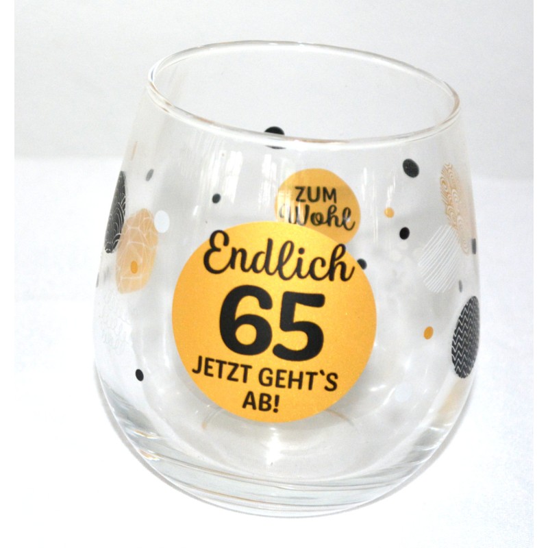 Glas mit Spruch "Endlich 65 Jetzt gehts ab ..."