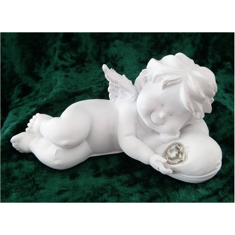 Süsser Engel auf einem Herzkissen mit Strasstein-Herz liegend.