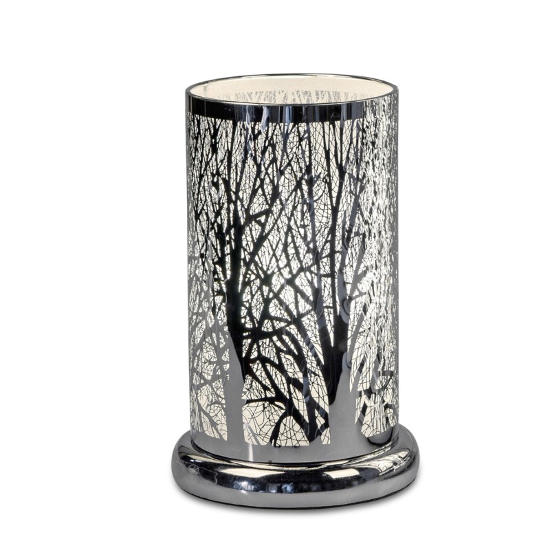 Die Lampe ist aus Metall gefertigt und hat ommem eome glitzernde Folie