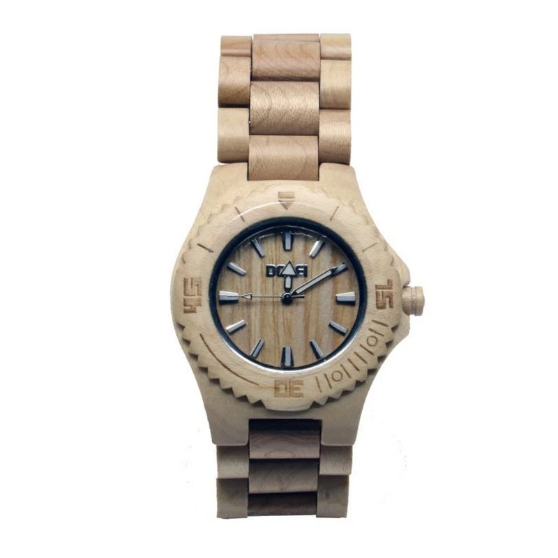 Eine Armbanduhr aus Ahorn Holz, einfach und funktionell, gekennzeichnet durch einzigartige Maserungen.