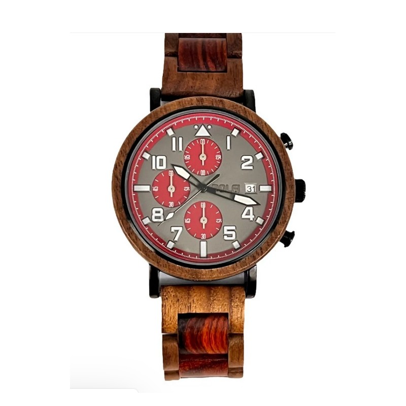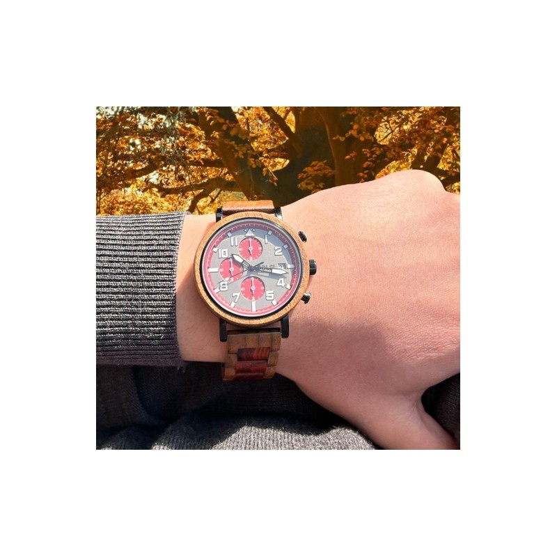 Ulisse Modell - Gehäuse: 43 mm Durchmesser, hergestellt aus dunklem Walnussholz und rotem Mandelholz.